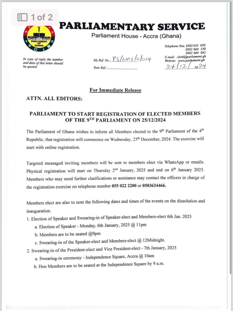 Parliament is expected to begin the registration process for Members of Parliament-elect for the upcoming 9th Parliament of the 4th Republic.